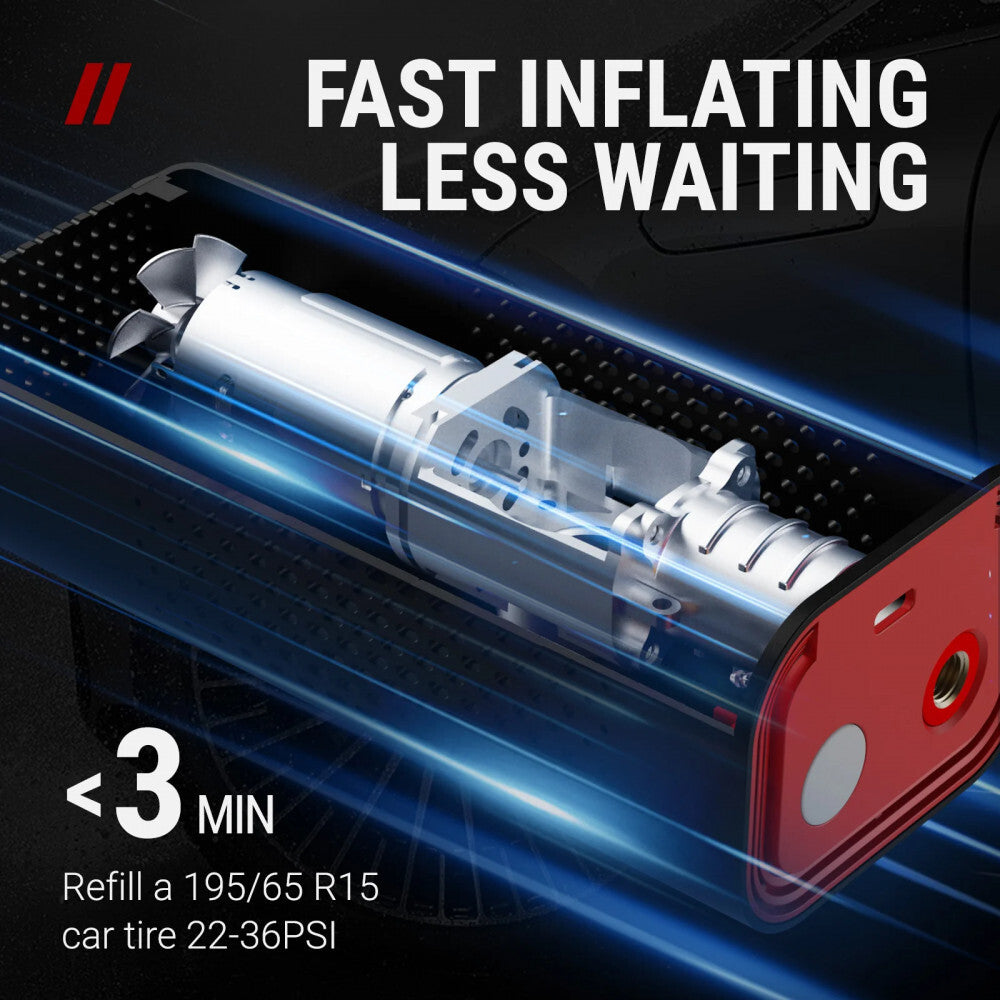 - UMFLARE RAPIDĂ ȘI EFICIENTĂ: Compresorul de aer portabil VacLife pentru anvelope auto este o soluție excelentă pentru situații de urgență în trafic. Pompa auto portabilă VacLife are un motor puternic care poate umfla rapid o anvelopă de dimensiunea 195/55 R15 de la 22 psi la 36 psi în mai puțin de 3 minute. De asemenea, se recomandă ca dispozitivul să se odihnească cel puțin 10 minute după fiecare 10 minute de utilizare.
