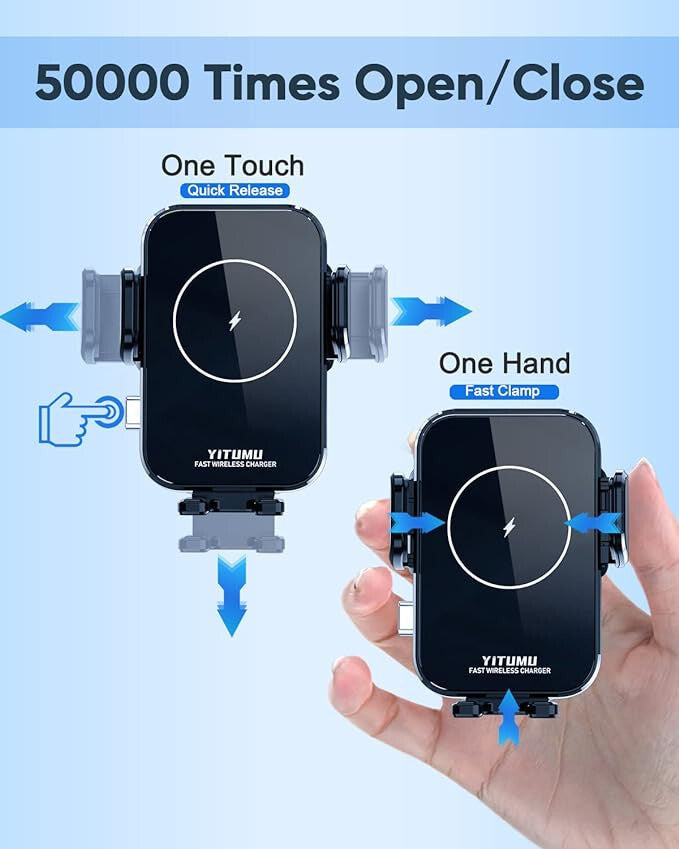 Suportul YITUMU pentru încărcare auto wireless are bobine de cupru întărite, cu o putere maximă de încărcare de până la 15 W și este compatibil cu orice telefon care suportă încărcare wireless Qi.