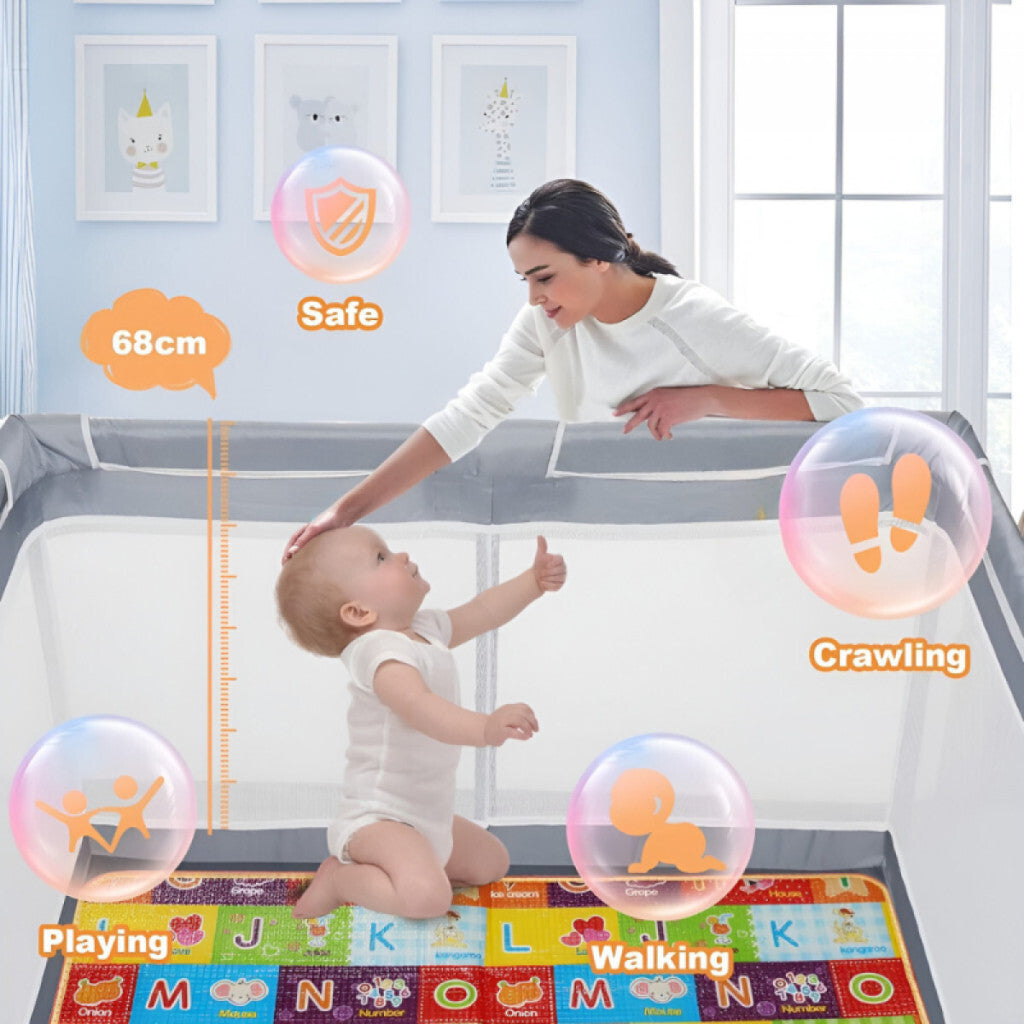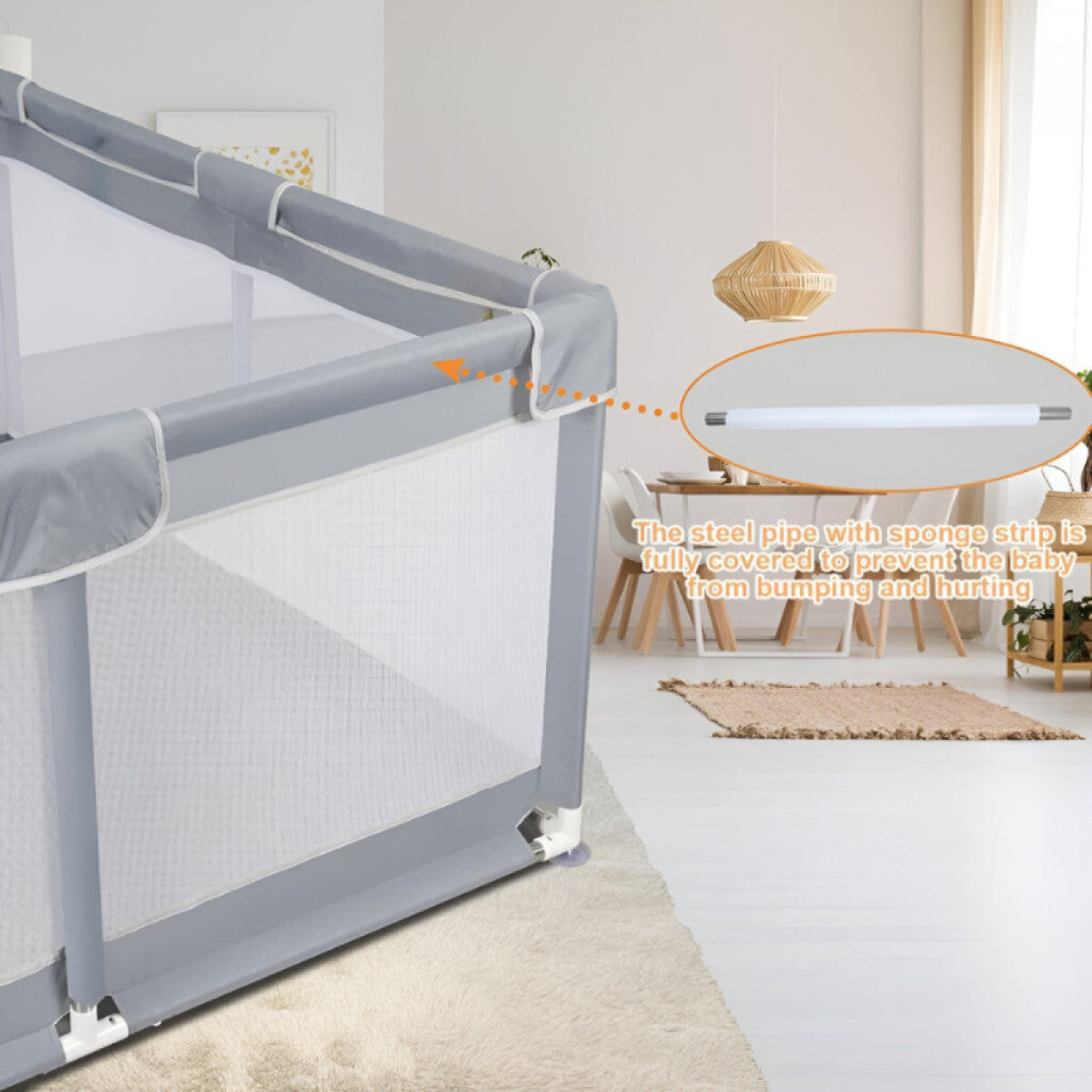 Parcul de joacă pentru bebeluși Tenckat este ideal pentru utilizare atât în interior, cât și în exterior, oferind un loc de joacă confortabil și protejat pentru cei mai mici. Salteaua moale și plasa respirabilă asigură confort maxim, în timp ce structura robustă garantează stabilitate pe termen lung. Dacă cauți un parc de joacă sigur, ușor și practic, Tenckat este alegerea perfectă pentru copilul tău!
