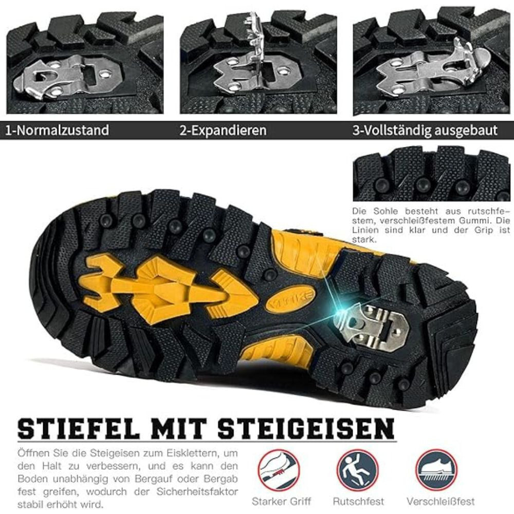 - Talpa antiderapantă este realizată cu un model unic și cu gheare metalice, oferind aderență sigură pe suprafețe înghețate sau alunecoase. Protecția groasă din cauciuc de la vârf oferă siguranță suplimentară, protejând degetele de eventuale lovituri. Căptușeala interioară moale asigură o căldură plăcută, iar branțul super moale oferă confort chiar și la purtări îndelungate.