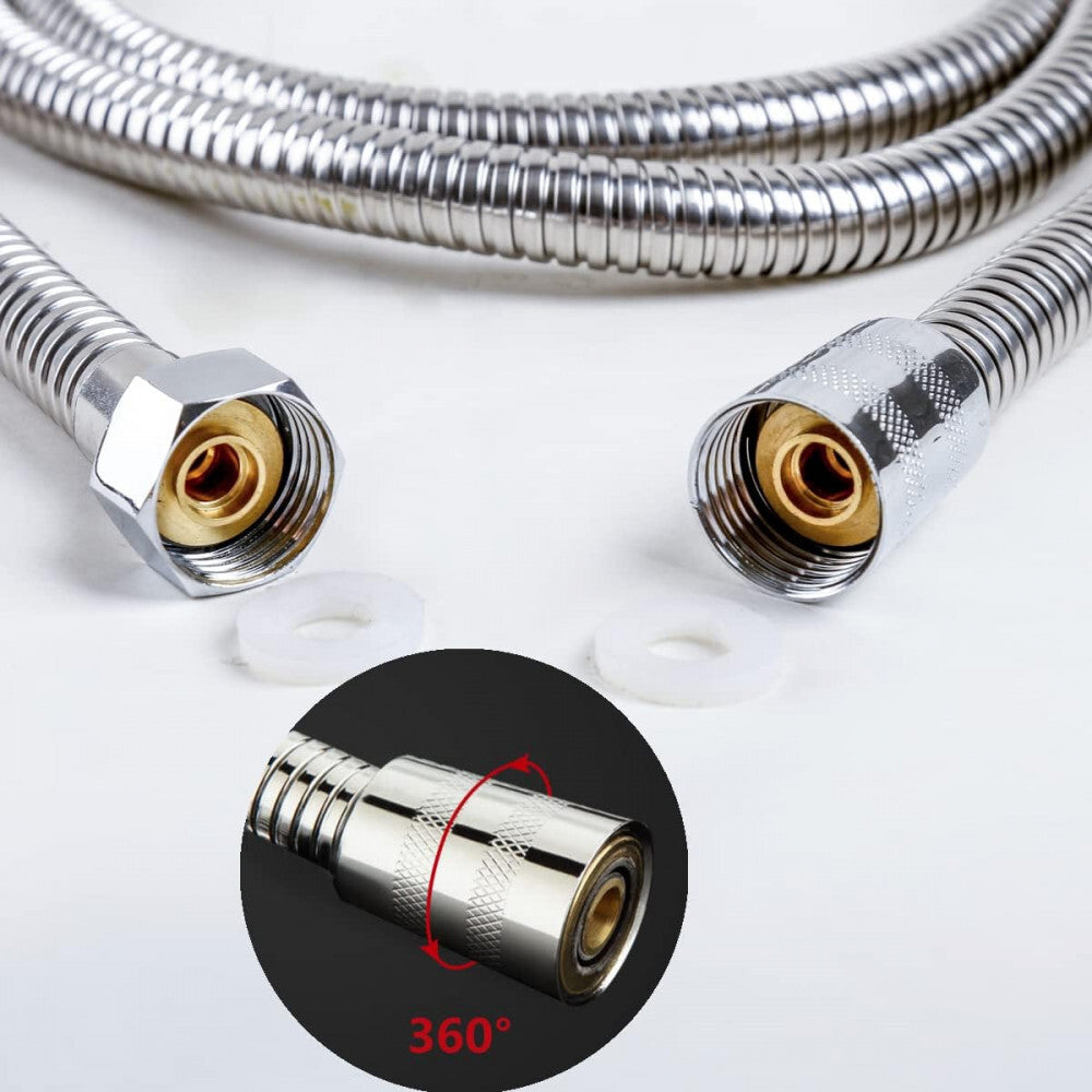 - Conectorii solizi din alamă sunt puternici, rezistenți la coroziune și, datorită designului rotativ, previn încurcarea furtunului, asigurând un flux de apă neîntrerupt. Lungimea de 1 metru este ideală pentru băi compacte, dar este perfectă și pentru utilizări multifuncționale: nu doar pentru duș, ci și pentru clătirea toaletei, spălarea animalelor de companie sau umplerea acvariului.