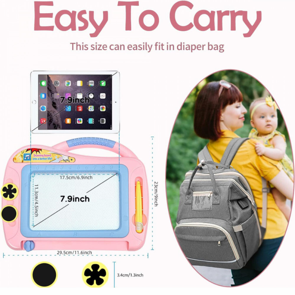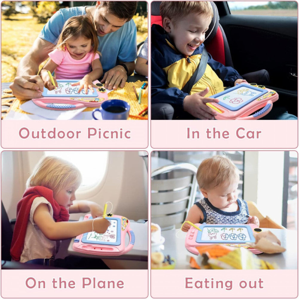 - Suprafață colorată de desen și dimensiune practică: Suprafața de desen cu patru zone colorate (verde, albastru, galben, roșu) oferă o experiență de desen mai vie și variată. Dimensiunea suprafeței de desen: 17,5 × 11,7 cm, dimensiunea ramei: 29,5 × 23 cm – ideală pentru călătorii cu mașina sau avionul.