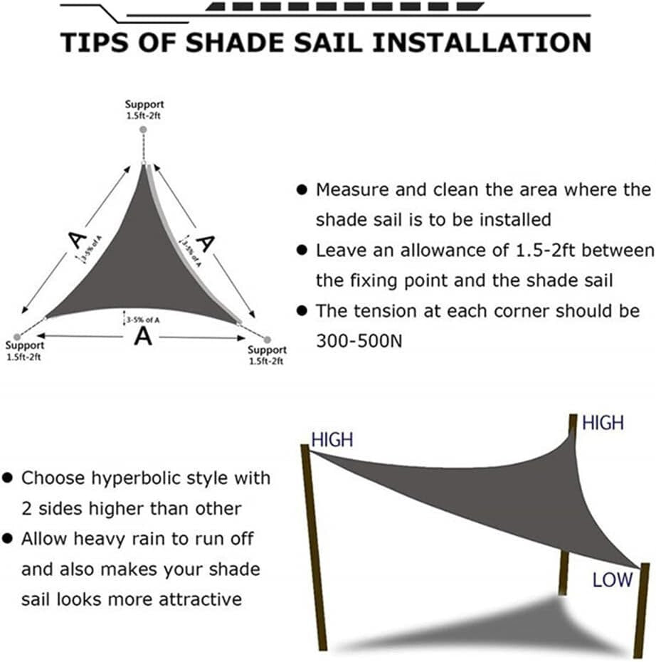 Montarea velei de soare este rapidă și simplă. Folosește punctele de sprijin ale clădirilor din jur, țăruși de oțel sau stâlpi, apoi fixează cu sforile incluse. Pentru o fixare stabilă și sigură, se recomandă să ții cont de direcția vântului.