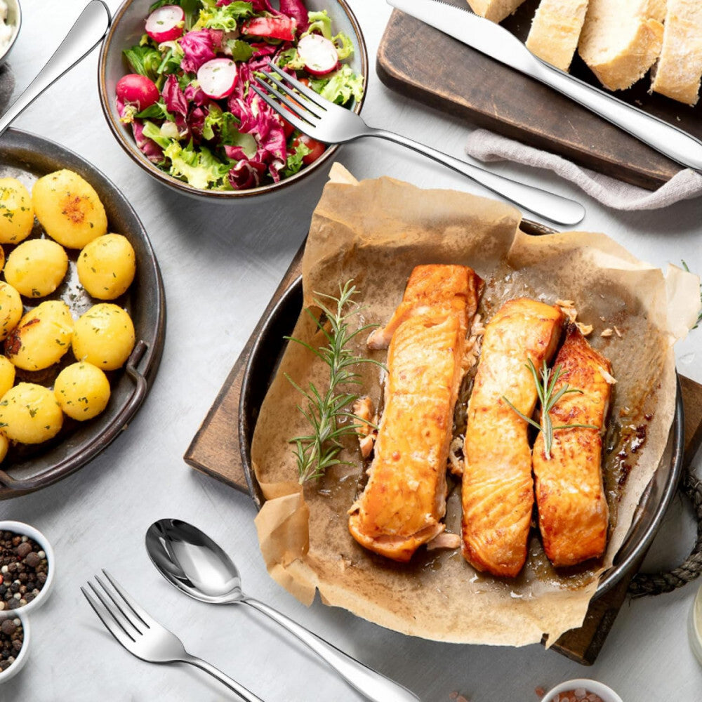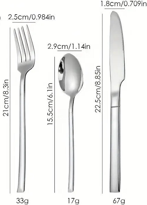 - Set de 6 piese: Pachetul conține 2 cuțite de masă, 2 furculițe și 2 lingurițe, acoperind toate nevoile de servire. - Durabilitate și întreținere ușoară: