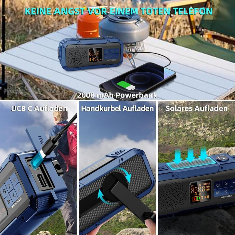 Radio solar cu manivelă KAYINOW 5 în 1 este partenerul indispensabil al aventurierilor în aer liber, drumeților și camperilor. Acest dispozitiv versatil, practic și durabil combină radio AM/FM, difuzor Bluetooth, power bank de 2000 mAh, lanternă și semnalizator de urgență SOS, pentru a te menține în siguranță și conectat în orice situație.