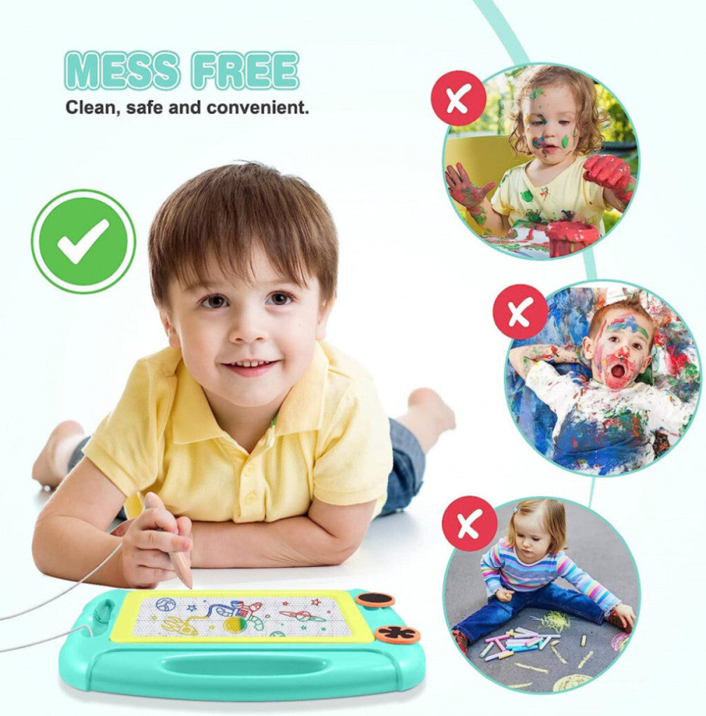 - Această tablă magnetică pentru desen este un instrument distractiv și sigur pentru cei mai mici, care permite redesenarea, ștergerea și bucuria exprimării libere. Cu culorile sale vii și designul practic, este o alegere ideală pentru joaca creativă acasă sau în deplasare.