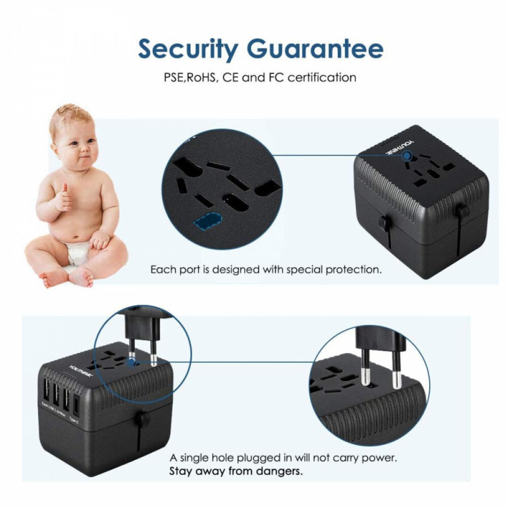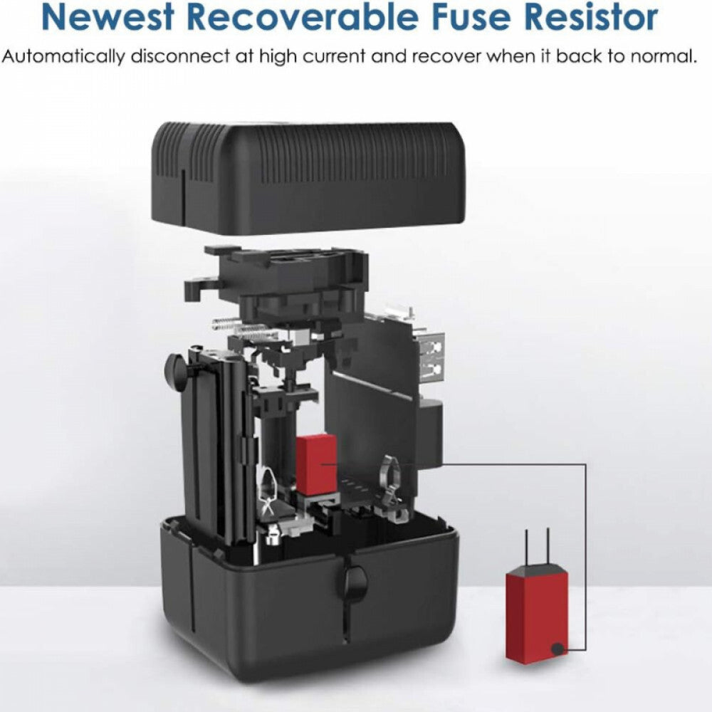Adaptorul de călătorie universal, echipat cu siguranță resetabilă automat, este soluția perfectă pentru încărcare sigură și comodă în întreaga lume, în peste 180 de țări – alegerea ideală pentru orice călător.