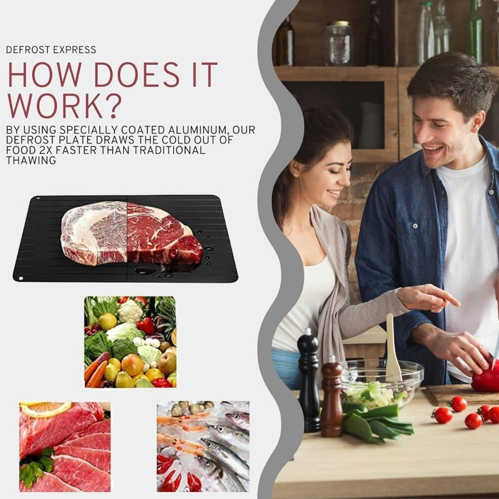 - Economisește timp și simplifică pregătirea în bucătărie cu ajutorul tăvii rapide de dezghețare. Această tavă premium din aluminiu, cu suprafață antiaderentă, dezgheață în câteva minute carnea, legumele sau alte alimente congelate datorită conductivității naturale a căldurii – fără a necesita curent electric, cuptor cu microunde sau substanțe chimice.
