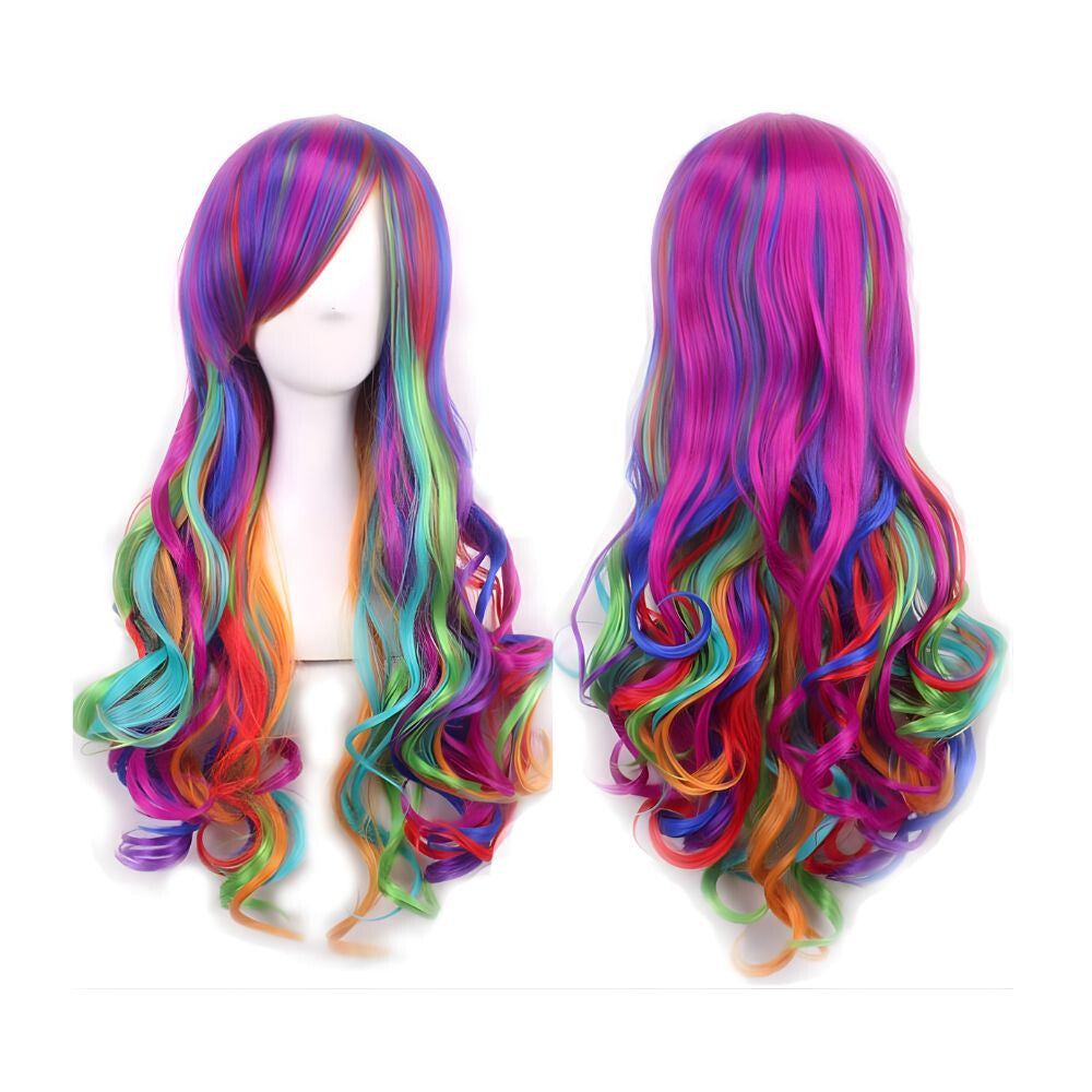 - Perucă lungă curcubeu pentru femei – creț, multicolor, cosplay și petrecere, păr sintetic rezistent la căldură