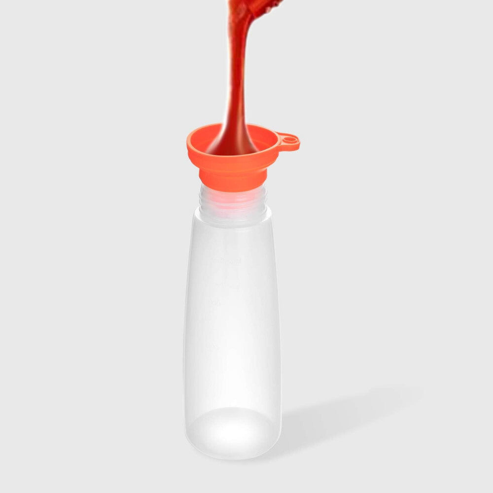 - Set de 3 sticle pentru sos LikeSun – sticle din plastic de 550 ml cu capace colorate și pâlnii din silicon