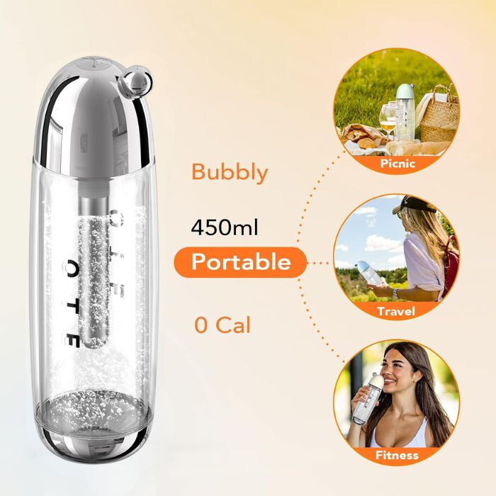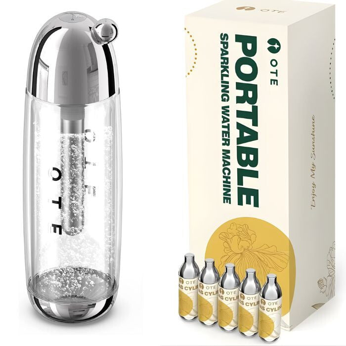 Mașina portabilă de sifon OTE în culoare argintie nu este doar practică, ci și un accesoriu stilat pentru viața ta de zi cu zi. Funcționează fără curent electric, astfel poți prepara rapid și ușor apă carbogazoasă proaspătă acasă, la birou sau chiar în timpul călătoriilor. Pachetul include 20 cartușe CO2, pentru a o putea folosi imediat.