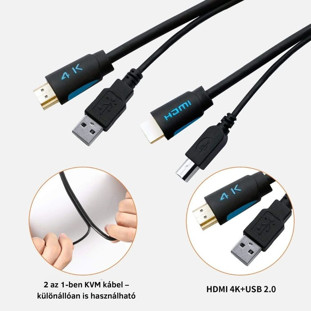 - Cablu include 1 conector HDMI male–male și 1 conector USB-A – USB-B (tip cablu imprimantă), fiind astfel o alegere ideală pentru conectarea switch-urilor KVM, calculatoarelor și perifericelor USB. Datorită designului 2 în 1, cablul HDMI poate fi folosit și separat sau împreună cu un switch KVM, după necesitate.
