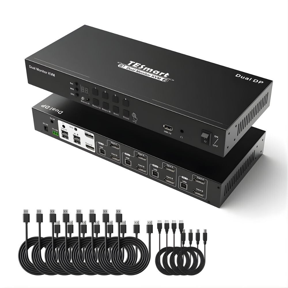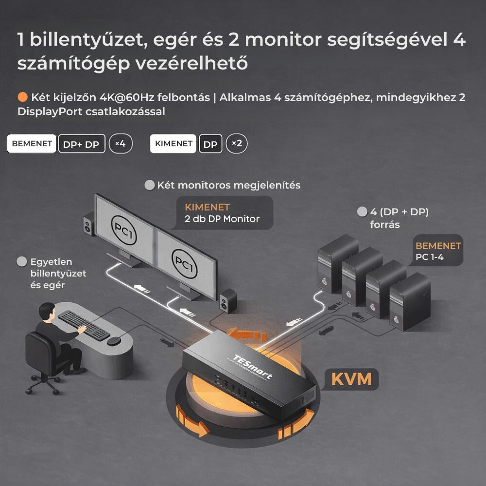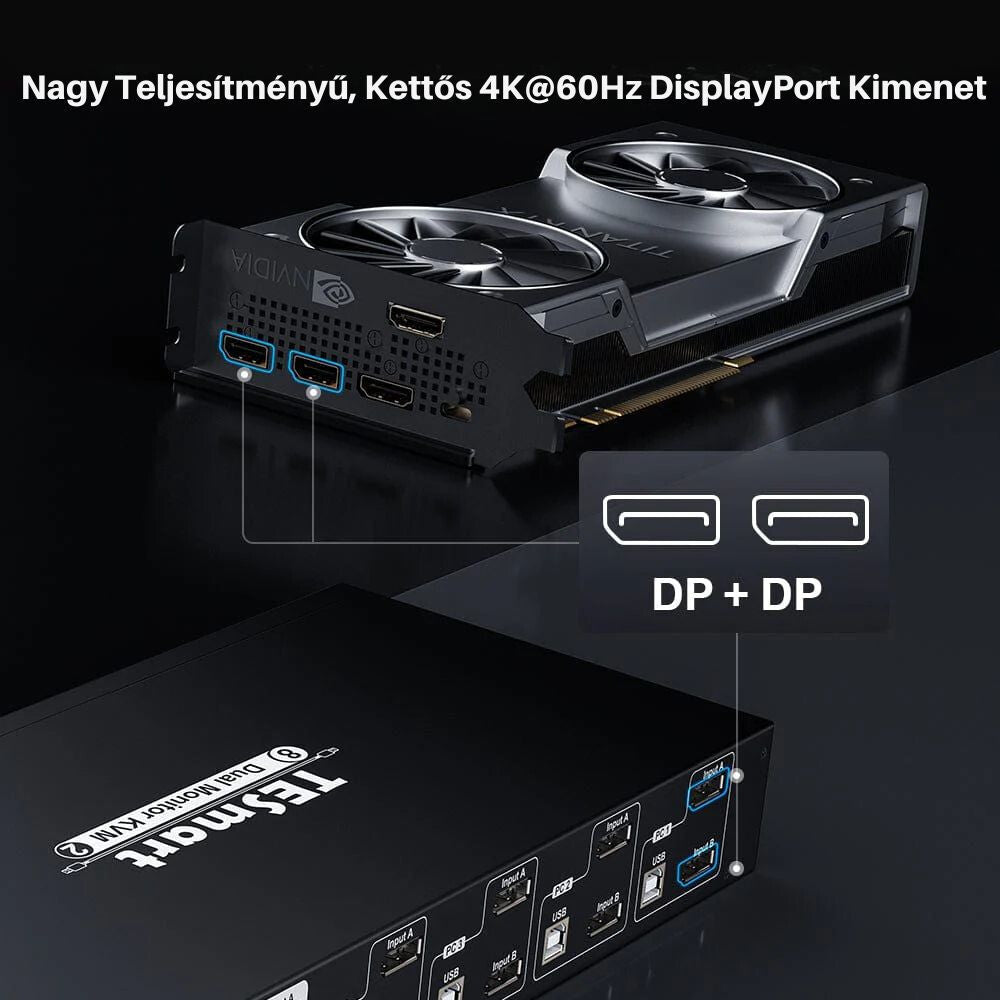 - Comutator KVM TESmart Dual Monitor DisplayPort – 8x2 (4 PC, 2 monitoare) 4K@60Hz, EDID, Hot Plug, USB 2.0, Pass-Through, DCCI