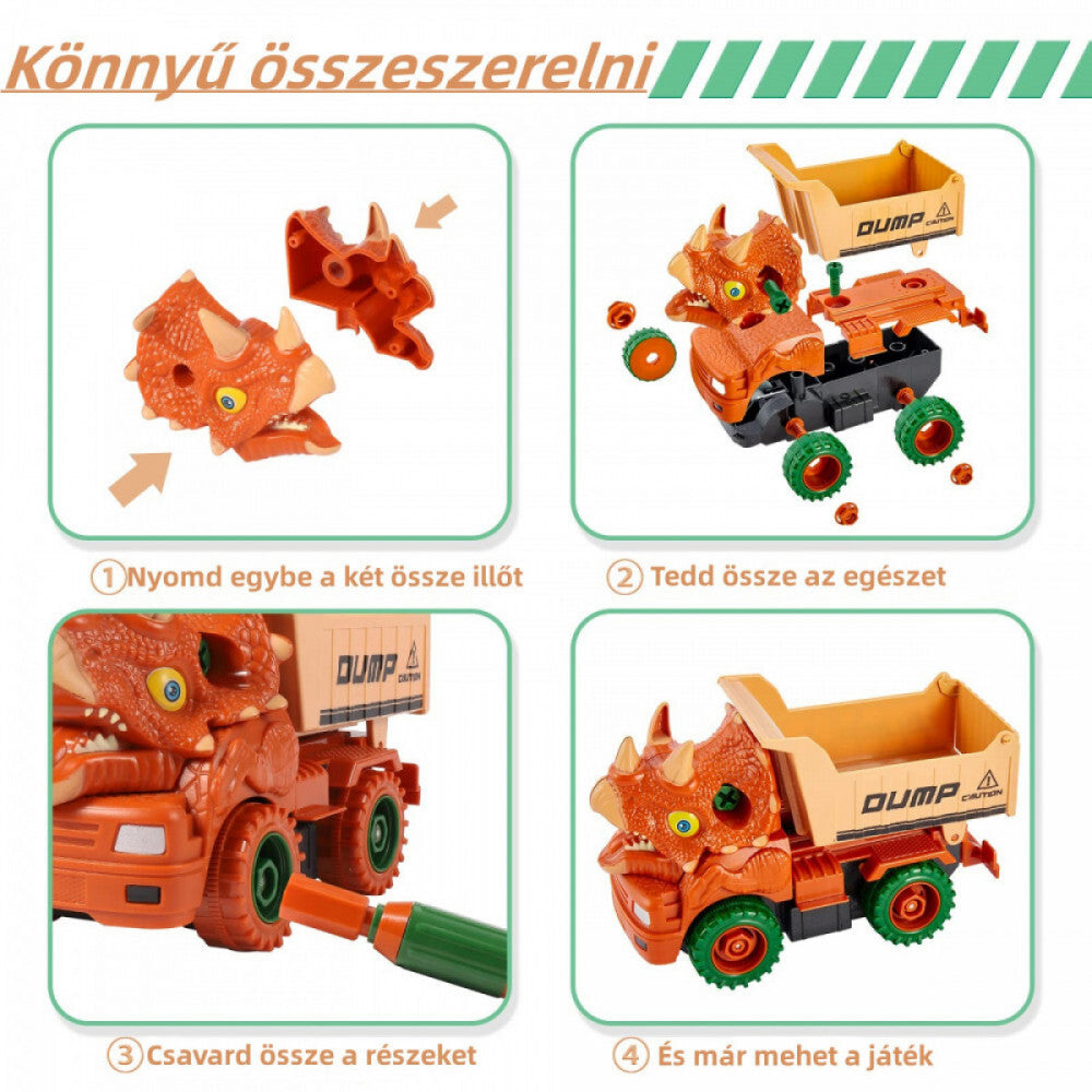 Montare ușoară și transformabilitate - Cu ajutorul șurubelnițelor și șuruburilor incluse, copiii pot demonta și reasambla cu ușurință vehiculele. Capetele de dinozaur și roțile sunt interschimbabile, oferind o experiență nouă de fiecare dată.