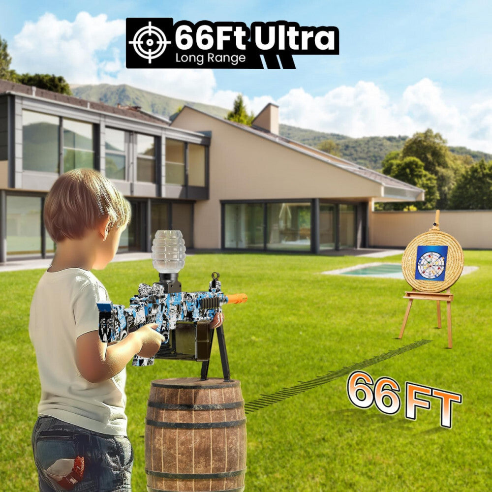 - Automat: Experimentați puterea neînfrânată a armei cu bile gel, care lovește cu ușurință țintele de la distanțe de până la 20 de metri. Trăgaciul are o capacitate de 600 bile, iar magazia de 800 bile, permițând atacuri de până la 600 de bile pe minut. Energia cinetică maximă a proiectilelor emise de capul de tragere cu bile gel este de 0,358 J, garantând focuri eficiente și puternice.